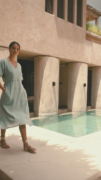 The Bella Cotton Dress in powder blue is made from airy cotton muslin, featuring practical side pockets and a tie-back to hug your waist just right. Its hand-stitched V-neck adds a charming touch, while the midi length and sleeves gracefully cover your upper arms. Side splits bring a breezy, elegant flow to every step you take.