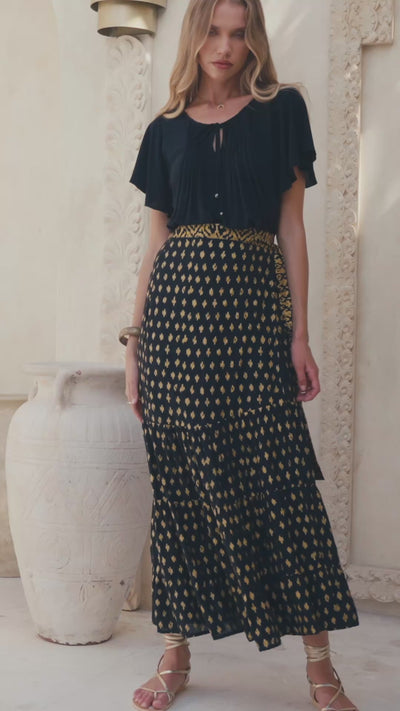 The Brooklyn Wrap Skirt in black with a shimmering gold print offers a sleek, full-length silhouette that effortlessly blends comfort with sophisticated style. Its wrap design allows for adjustable fit, while the luxurious gold accents add a touch of chic, making it ideal for both lunch and cocktail hour.