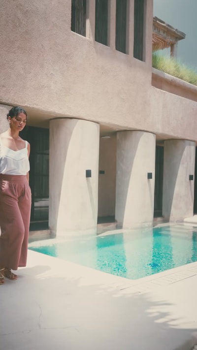 The Coco pants in dusty pink bring together a soft cotton-linen blend with a stylish pleated front waistband and a shirred elastic back that keeps you comfy when on the move. With a relaxed billowy leg and lightweight, textured fabric, they’re made to flatter without holding you back. Ideal for everyday wear during spring and summer.