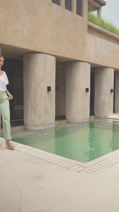The Coco cropped pants in olive bring together a soft cotton-linen blend with a stylish pleated front waistband and a shirred elastic back that keeps you comfy when on the move. With a relaxed billowy leg and lightweight, textured fabric, they’re made to flatter without holding you back. Ideal for everyday wear during spring and summer. Complete the look with the Celia Camisole and Capri shimmering gold sandals.