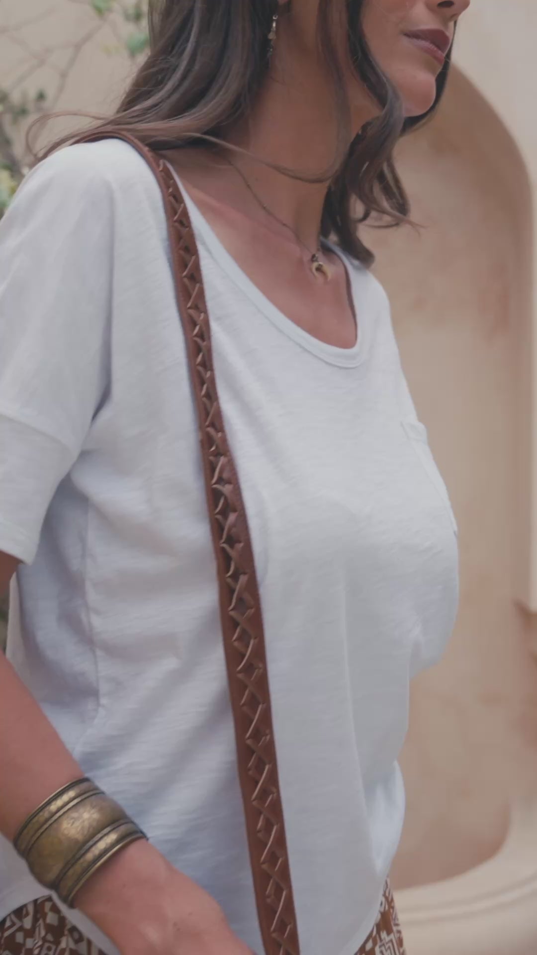Evelyn is an elegant white cotton slub t-shirt featuring a softly rounded neckline and sleeves that gracefully cover the upper arms for a refined silhouette. Made from breathable textured fabric, it is enhanced with a subtle decorative pocket on the front, making it a timeless wardrobe essential.