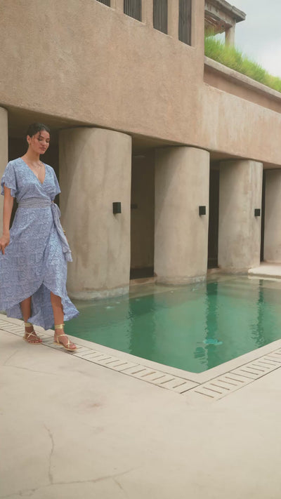 The Isabel maxi wrap dress features a soft grey sash belt, bell sleeves, and a flowing full skirt, all lined for comfort. Adorned with a delicate powder blue Moroccan-inspired print, it’s made from lightweight, breathable fabric—perfect for sunny summer lunches with friends. Complete the look with the beautiful Capri shimmering gold wrap around sandals.
