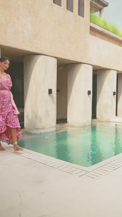 The Isabel maxi wrap dress features a soft pink sash belt, bell sleeves, and a flowing full skirt, all lined for comfort. Adorned with a vibrant ruby Moroccan-inspired print, it’s made from lightweight, breathable fabric—perfect for long sunny summer lunches with friends. Complete the look with the beautiful Capri shimmering gold wrap around sandals.