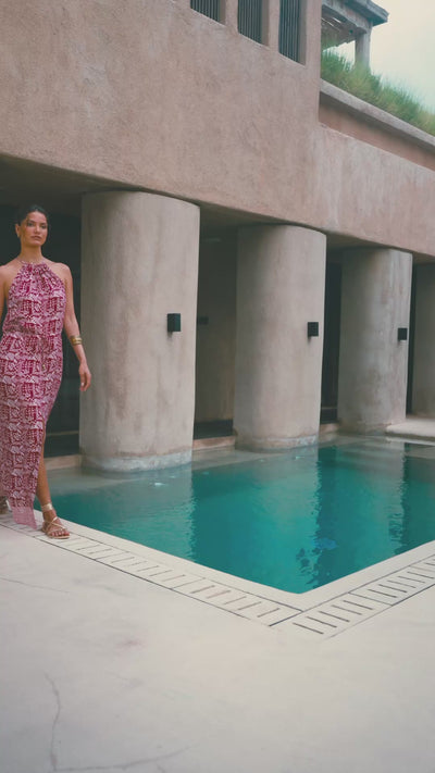 The lovely Lyla Drawstring Dress in a ruby Moroccan print showcases an elegant soft pink border, designed for those seeking understated luxury. Adjustable drawstrings at both the waist and neckline allow you to shift between relaxed and structured silhouettes, making it an indispensable piece for any season.
